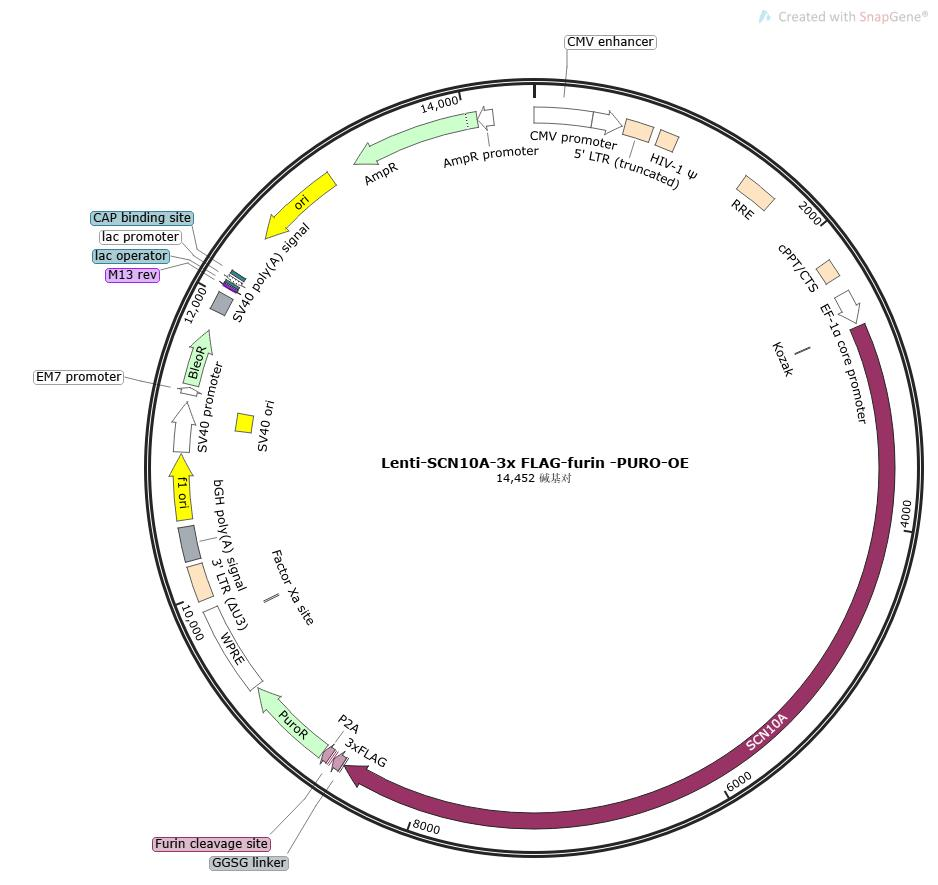 将目标基因SCN10A的编码序列克隆至慢病毒表达载体pLV-EF1a-MCS-3×flag-puro中,构建C端融合3×Flag标签的表达载体。包装取得高滴度慢病毒颗粒后,感染人胚肾细胞HEK293T。顺利获得蛋白质免疫印迹(Western Blot, WB)使用抗Flag抗体检测融合蛋白的表达水平,以验证目的基因的过表达效率。